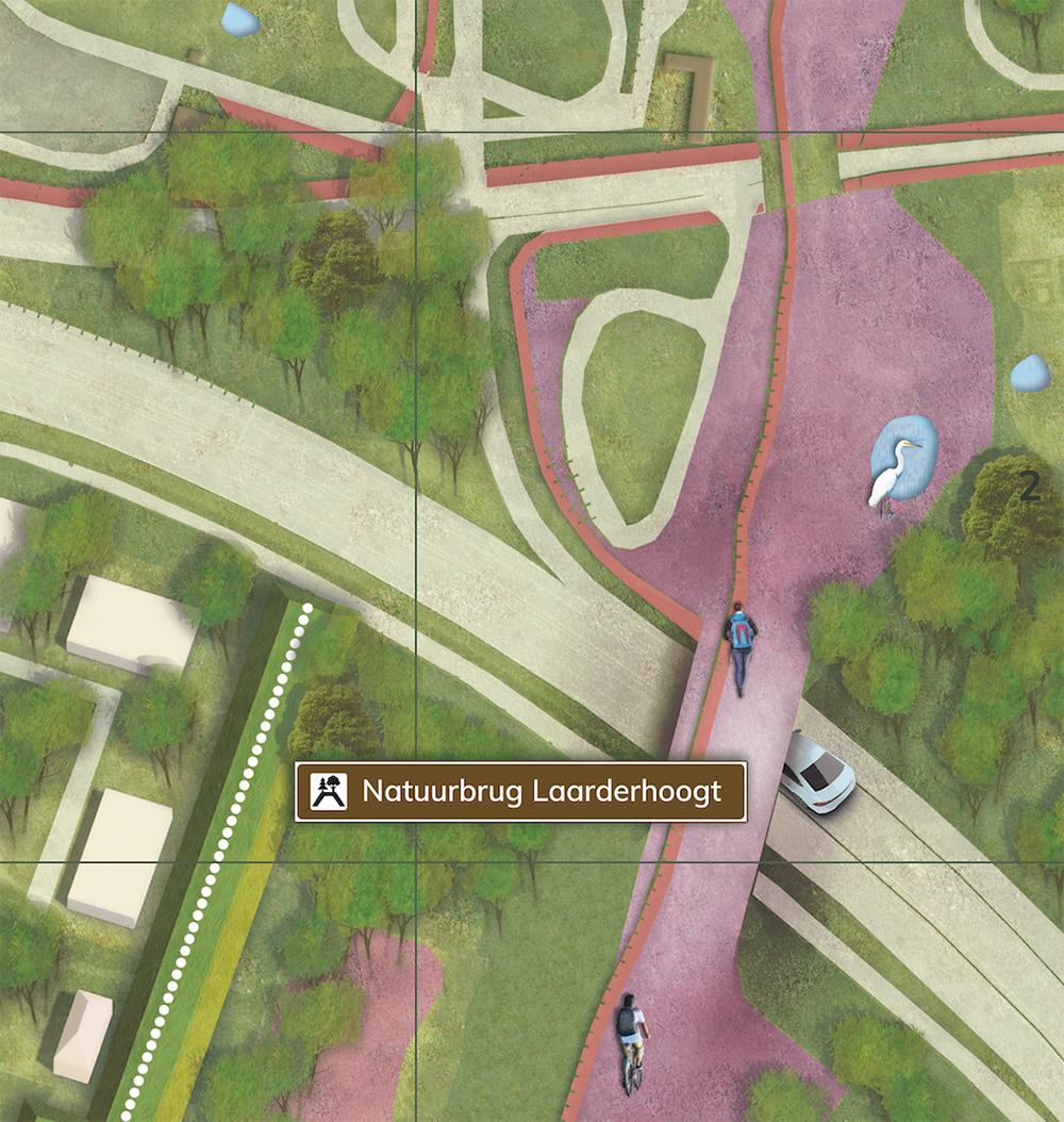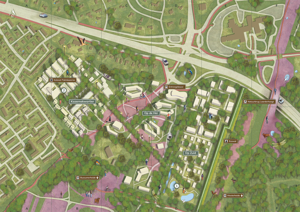 Kaart van plangebied Crailo, met de drie woongebieden, de heide omgeving en natuurbrug.