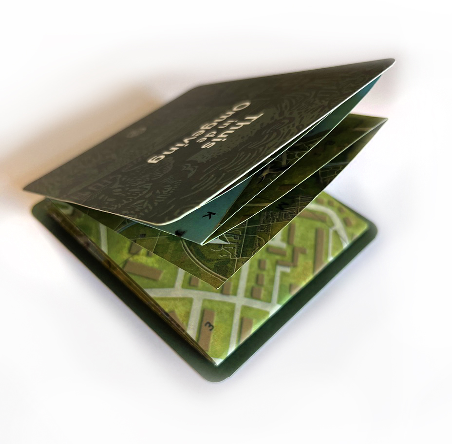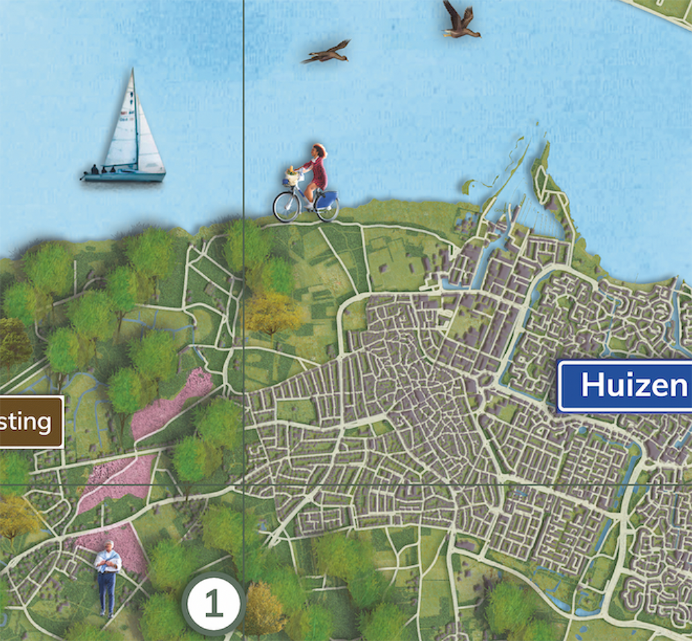 Op de achterkant staat het buurtschap in zijn ruime omgeving; midden in het Gooi. Met de omliggende plaatsen Hilversum, Naarden, Laren en Huizen en de natuurgebieden.