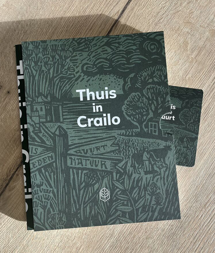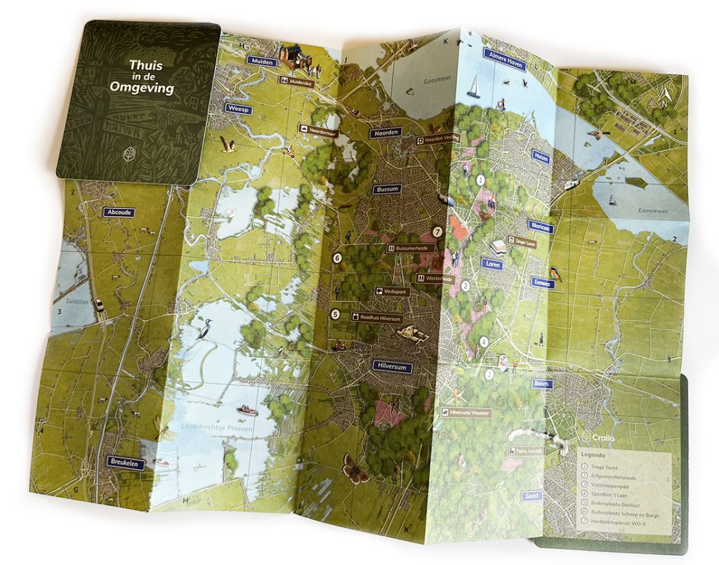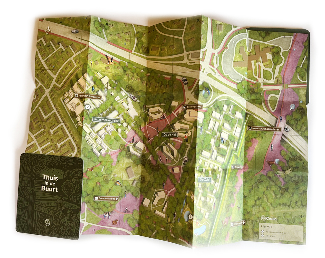 Voor een uitgave van GEM Crailo B.V. maakten we een dubbelzijdige plattegrond. Met op de voorkant het toekomstige buurtschap Crailo, met 590 woningen in het groen. Het stedenbouwkundig plan diende als basis om alle elementen op de kaart te zetten; de drie wijken met bebouwing, straten en groen. Deze plattegrond is onder meer een visualisatie van de verkaveling – plangebied en directe omgeving.